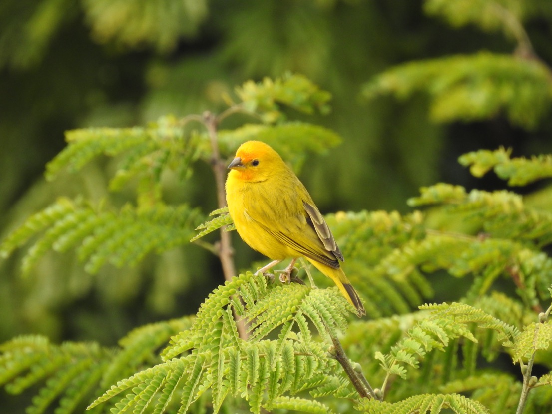 The saffron finch (Sicalis flaveola) is a tanager from South America that is common in open and semi-open areas in lowlands outside the Amazon Basin. They have a wide distribution in Colombia, northern Venezuela (where it is called «canario de tejado» or «roof canary»), western Ecuador, western Peru, eastern and southern Brazil (where it is called «canário da terra» or «native canary»), Bolivia, Paraguay, Uruguay, northern Argentina, and Trinidad and Tobago. It has also been introduced to Hawaii, Puerto Rico and elsewhere. Although commonly regarded as a canary, it is not related to the Atlantic canary. Formerly, it was placed in the Emberizidae but it is close to the seedeaters. The male is bright yellow with an orange crown which distinguishes it from most other yellow finches (the exception being the orange-fronted yellow finch). The females are more confusing and are usually just a slightly duller version of the male, but in the southern subspecies S. f. pelzelni they are olive-brown with heavy dark streaks.